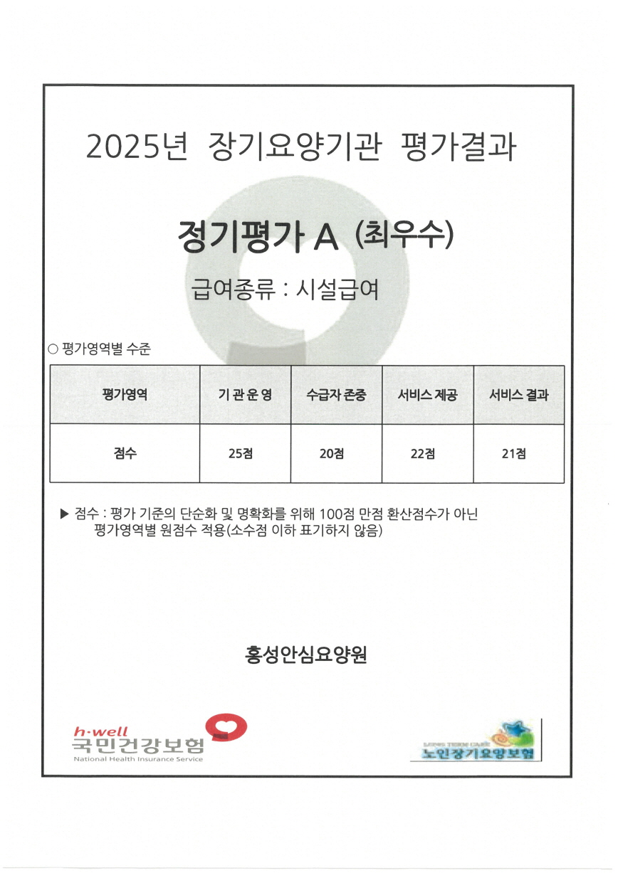 안녕하십니까. 홍성안심요양원입니다. 저희 요양원이 2025년도 장기요양기관 평가에서 최우수 등급을 받는 영예를 안았습니다. 이번 평가는 어르신 돌봄의 전문성, 안전관리, 인권보호, 급여제공의 적정성, 기관 운영의 투명성 등 전반적인 항목에 대해 엄격하게 이루어졌으며, 그 결과 최고 등급을 받게 되었습니다. 이 값진 성과는 무엇보다도 어르신을 믿고 맡겨주신 보호자님의 신뢰와 협조, 그리고 현장에서 묵묵히 최선을 다해준 직원들의 헌신이 있었기에 가능했습니다. 홍성안심요양원은 앞으로도 변함없는 관심과 성원에 깊이 감사드립니다. 감사합니다. 2026년 2월 27일