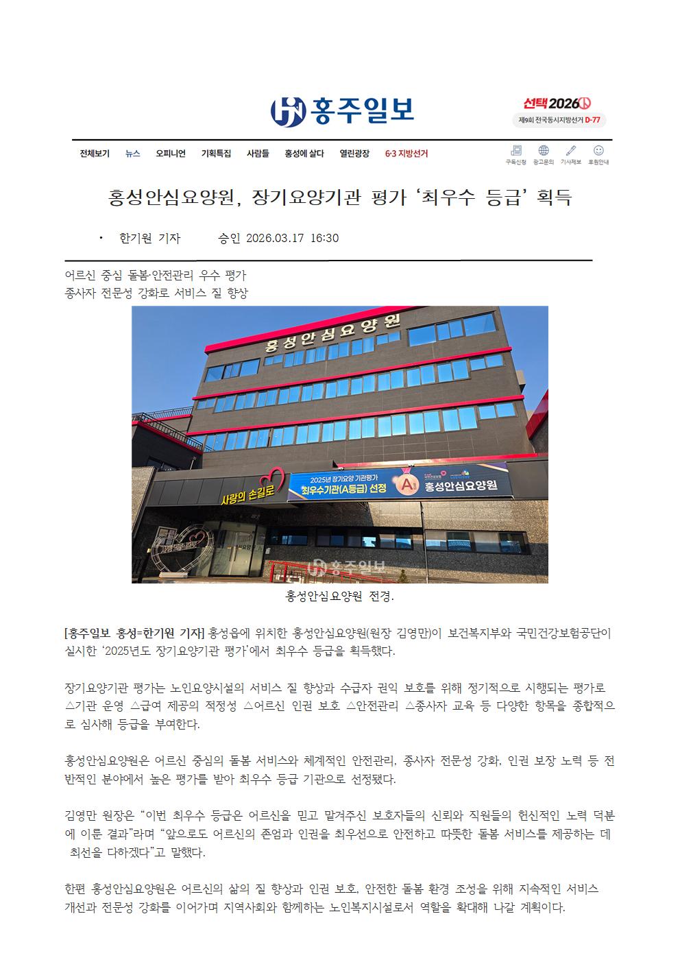 홍주신문사 게재 "홍성안심요양원 장기요양기관 평가 최우수 등급 획득