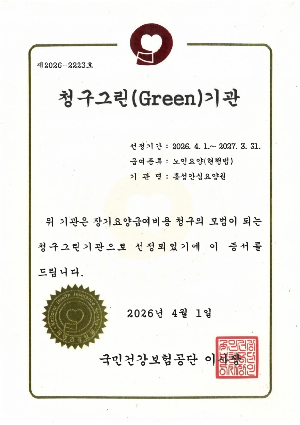 ![]() 홍성안심요양원은 국민건강보험공단으로부터 ‘청구그린기관’으로 지정되었습니다. 청구그린기관은 장기요양 급여비용을 투명하고 정확하게 청구하며, 올바른 운영과 윤리경영을 실천하는 기관에게 부여되는 인증입니다. 우리 홍성안심요양원은 어르신 한 분 한 분의 권익을 최우선으로 생각하며, 정직하고 책임 있는 운영을 통해 신뢰받는 요양기관이 되고자 노력해 왔습니다. 이번 청구그린기관 지정은 그동안의 노력을 인정받은 뜻 깊은 성과이며, 앞으로도 더욱 투명하고 공정한 기관 운영을 이어가라는 의미로 받아들이고 있습니다. 앞으로도 홍성안심요양원은어르신의 행복과 안전, 그리고 보호자님의 신뢰를 바탕으로지역사회와 함께하는 모범적인 요양기관이 되겠습니다. 감사합니다. |